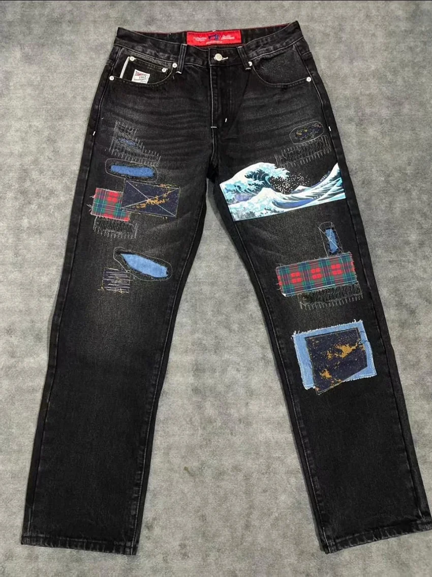 Make a bold fashion statement with these stylish washed black denim jeans featuring artistic patchwork and graphic design elements. Designed with a unique mix of stitched patches, textured repairs, and standout artwork detailing, these jeans bring a creative streetwear vibe to your wardrobe. Crafted from premium-quality denim fabric, they offer durability, comfort, and distinctive style-perfect for everyday casual wear.