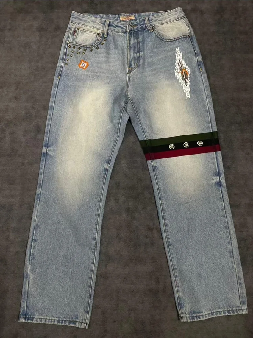 Upgrade your casual wardrobe with these premium washed denim jeans designed with bold stripe detailing and stylish stud accents. Featuring a modern streetwear-inspired look, these jeans combine a light washed finish with metallic stud embellishments and a distinctive side stripe pattern that adds a fashionable edge. Crafted from high-quality denim fabric, they deliver durability, comfort, and standout style-perfect for everyday wear and urban fashion.